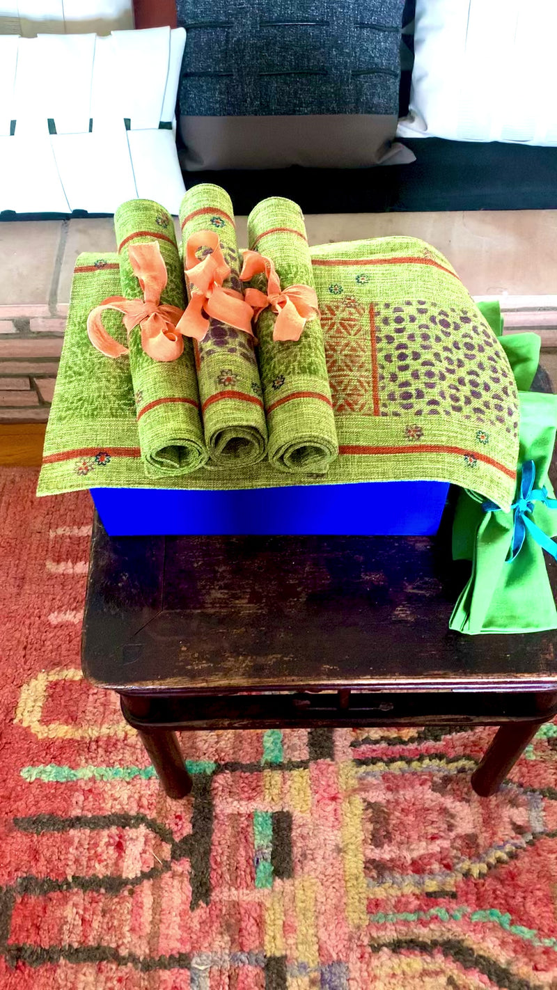 Sophisticated Set of Linen Placemats in Green Orange for Chic Dining